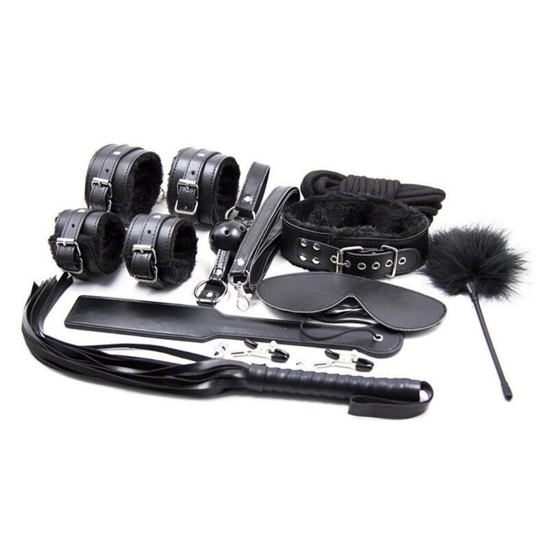 One set includes: Blindfold, Mouth ball gag, Sex neck collar, Hand cuffs, Ankle cuffs, Nipple clamps, Paddle, Whipe, Rope(5M), Feather tickler.(as picture)