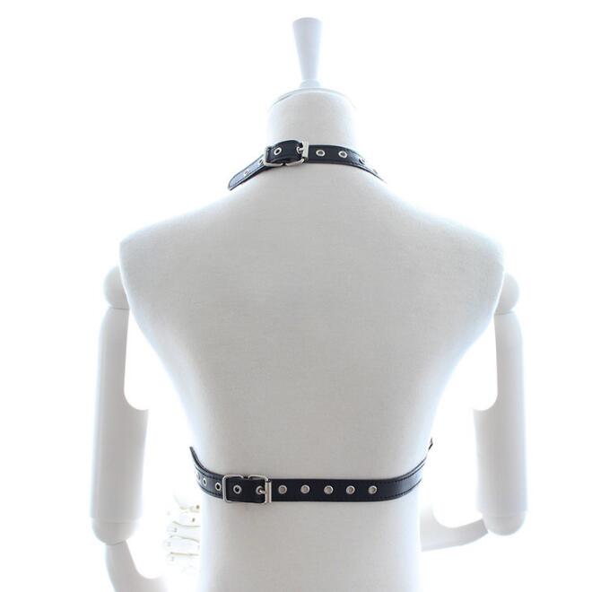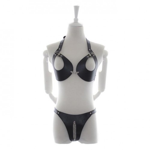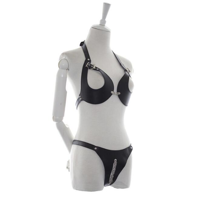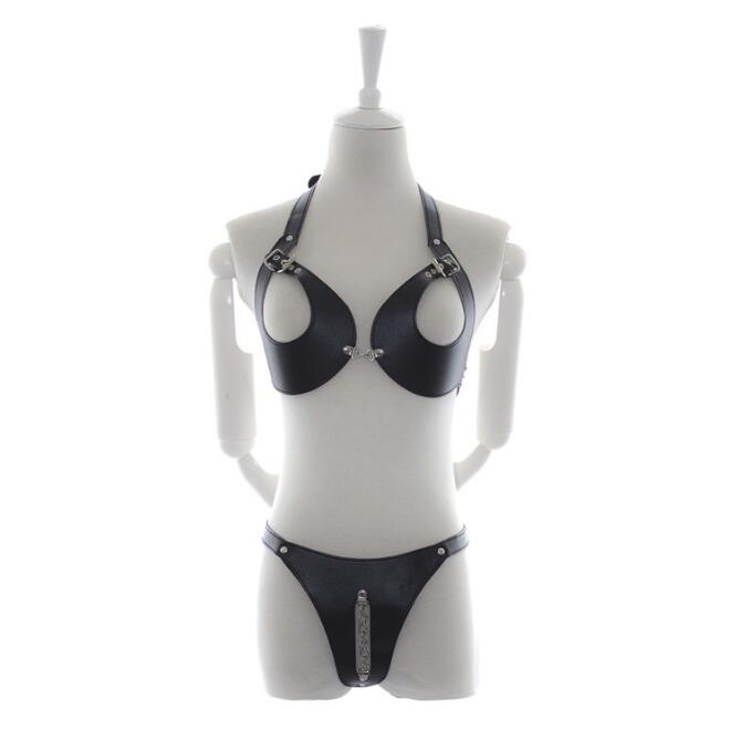 Women's Leather Sexy Bondage Exposed Nipple Lingerie Sex Set, Erotic Costume Fetish Underwear Knicker with Chain
