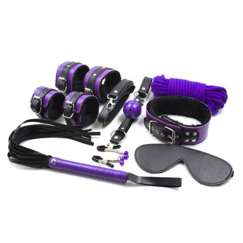 One set includes: Whip, rope (about 5 meters), blindfold, handcuffs, ankle cuffs, collar, mouth ball gag, nipple clamps. (as picture)